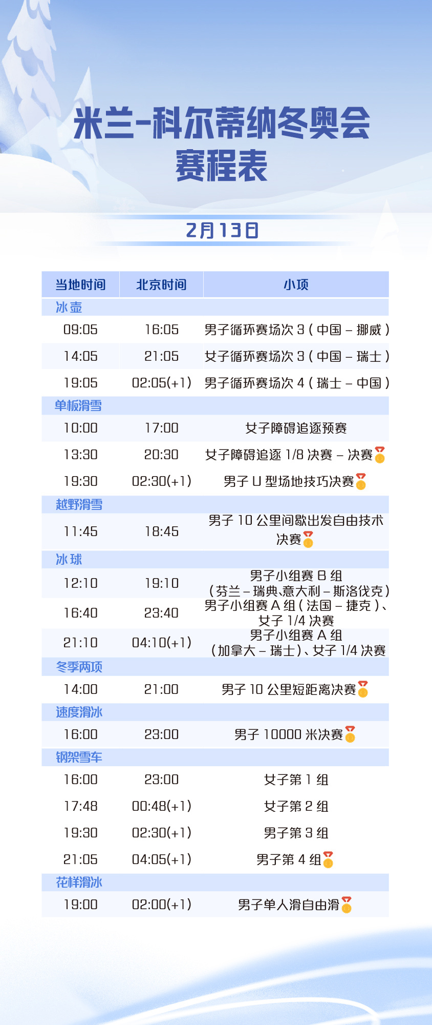 米兰冬奥会今天将产生7枚金牌,中国男子冰壶队将一日双赛,而花样滑冰将决出男子单人冠军,年轻的中国钢架雪车队期待再次实现突破。